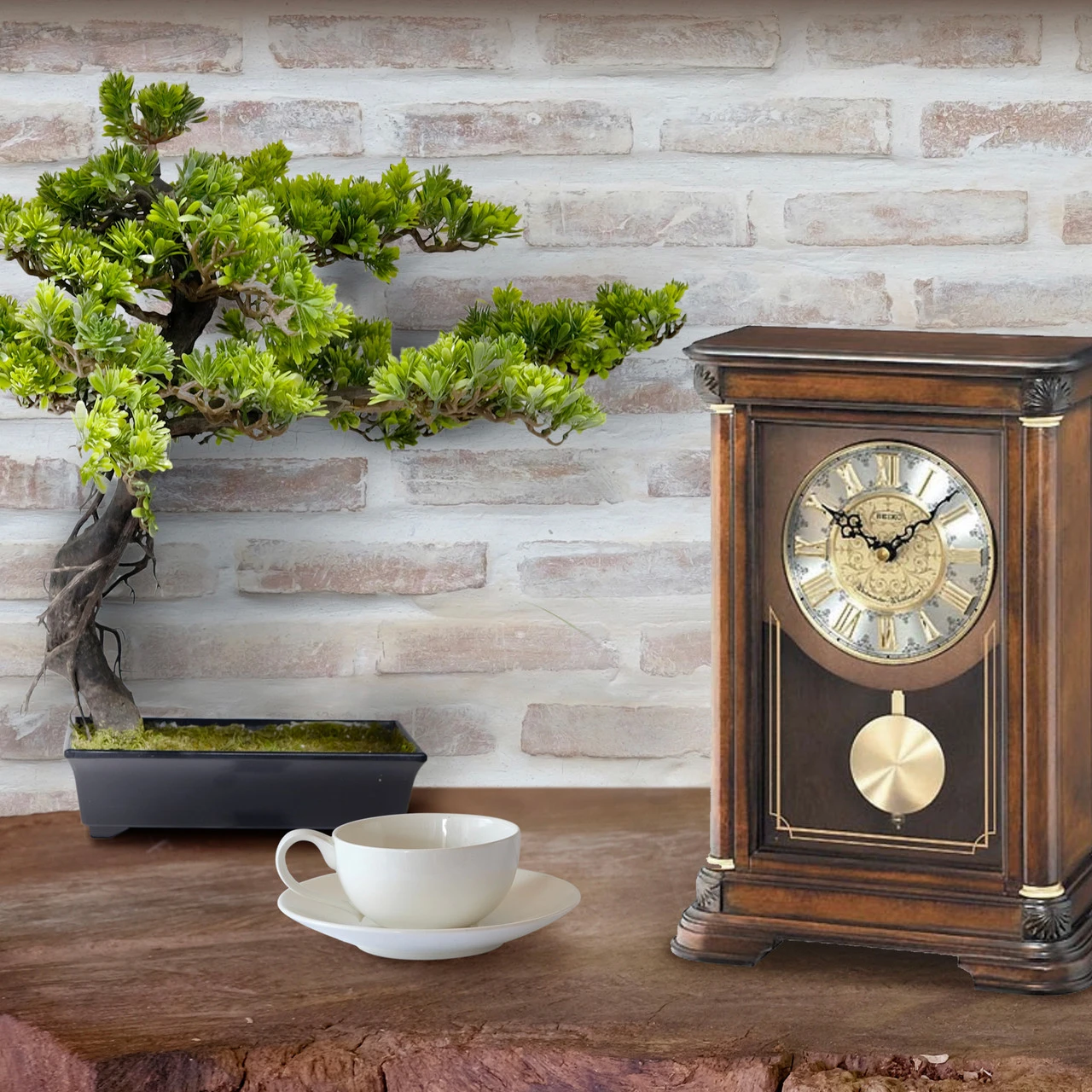 - An attractive clock with roman numerals and decorative hour and minute hands.