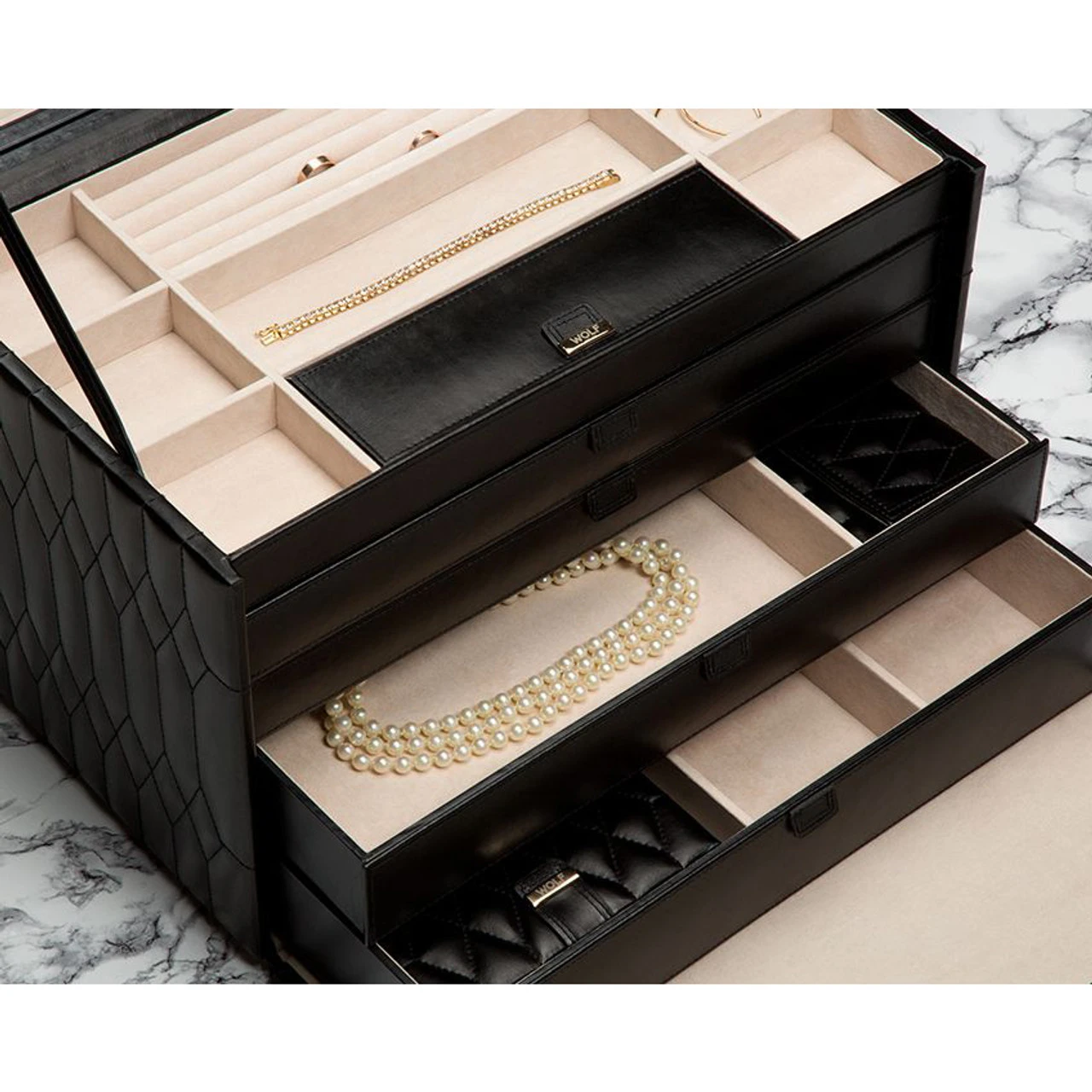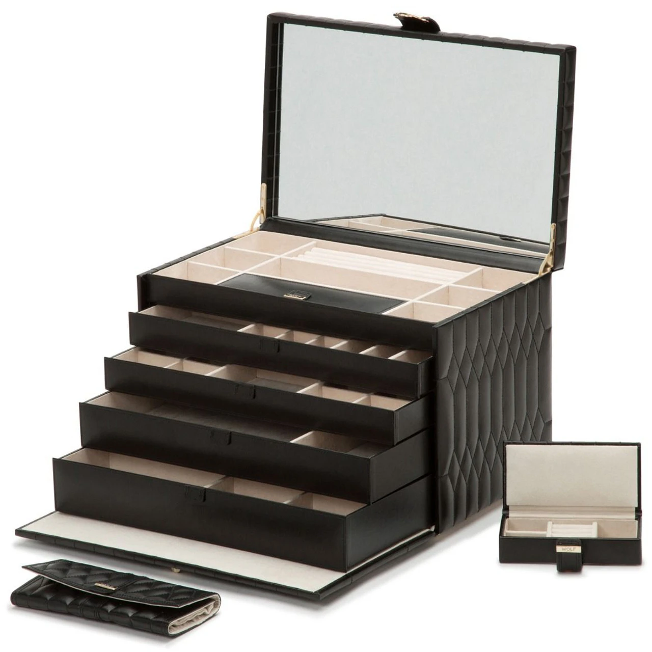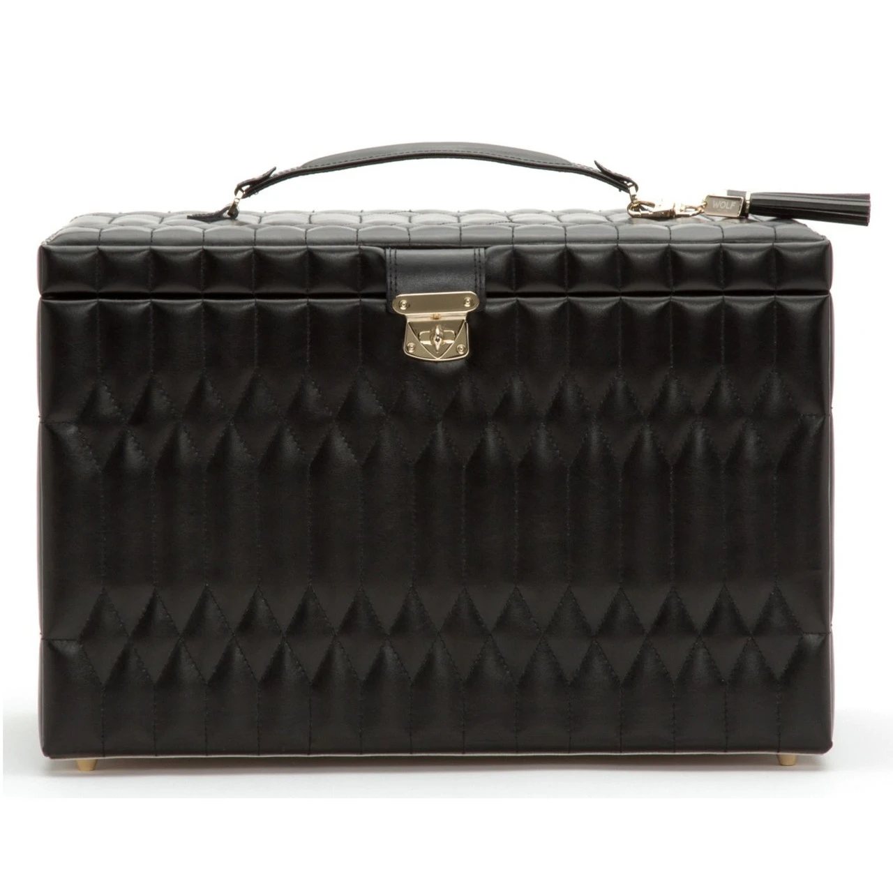 - The Caroline Extra Large Jewellery Case, a timeless classic with elegant soft lines of the 50’s, supple diamond-quilted leather accented with gold hardware.