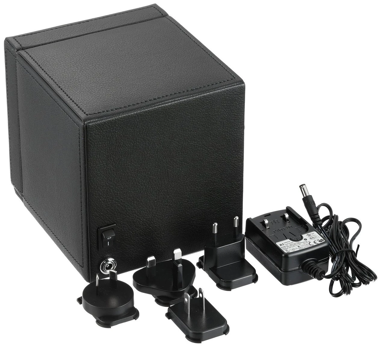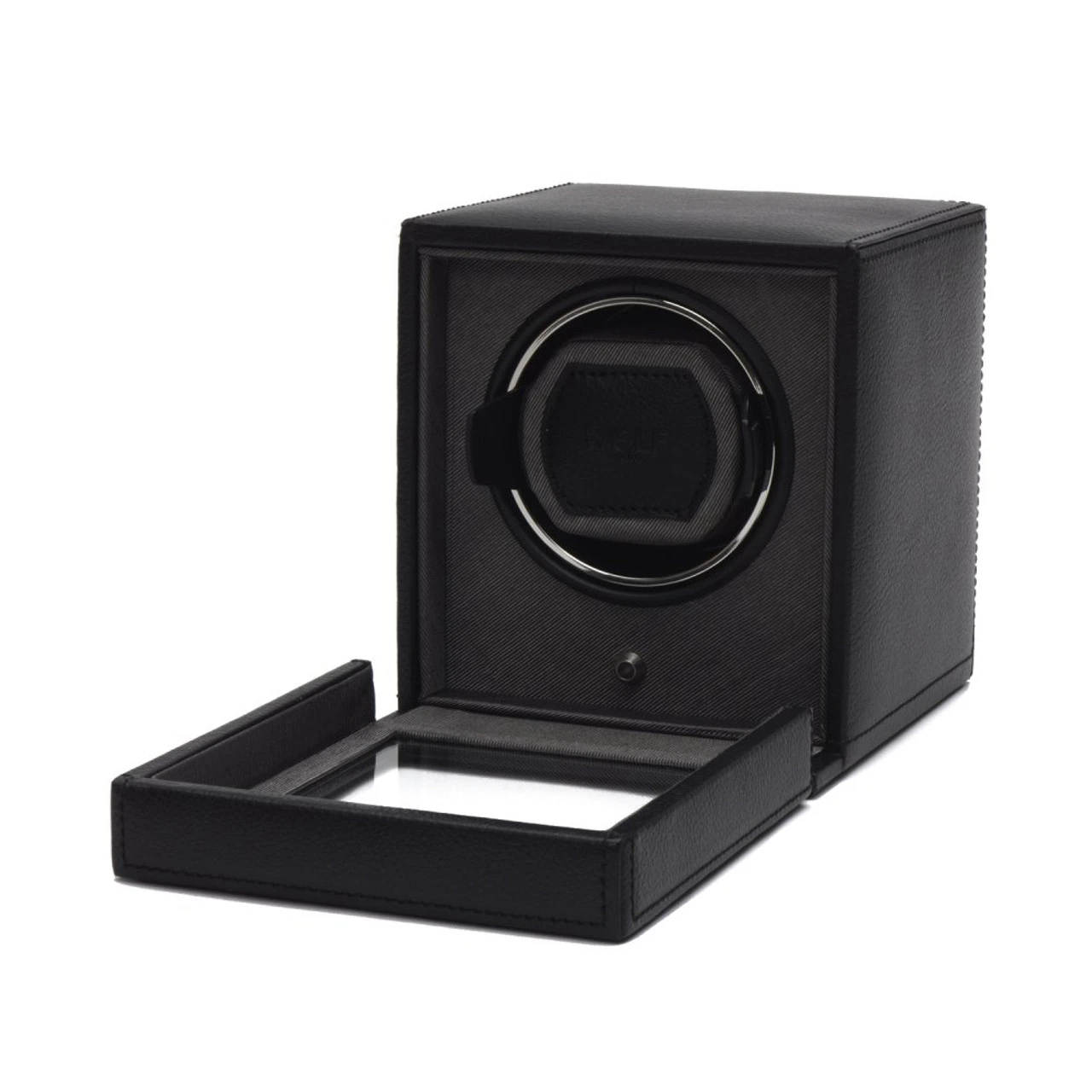 - The single watch winder has a textured black finished leatherette exterior.